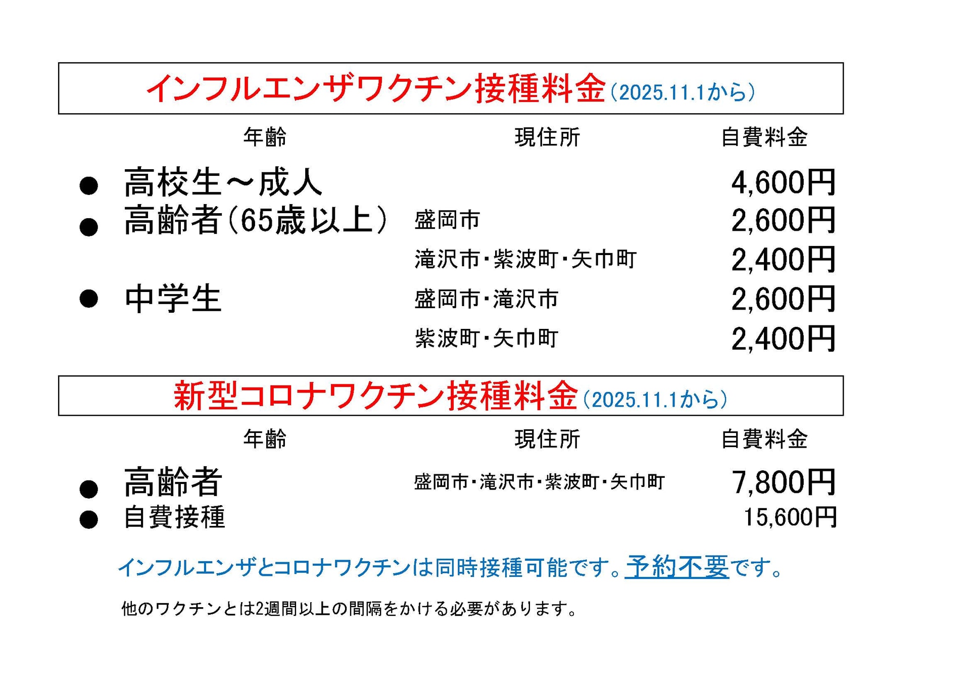 2025年11月1日から開始します。接種料金などは下記の通りです。